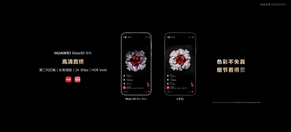 余承东表示,Mate 80系列搭载第二代红枫影像系统和长焦微距能力,在直播中展现出显著优势,色彩不失真,细节看得见,欢迎主播们拿起华为Mate80开播吧。