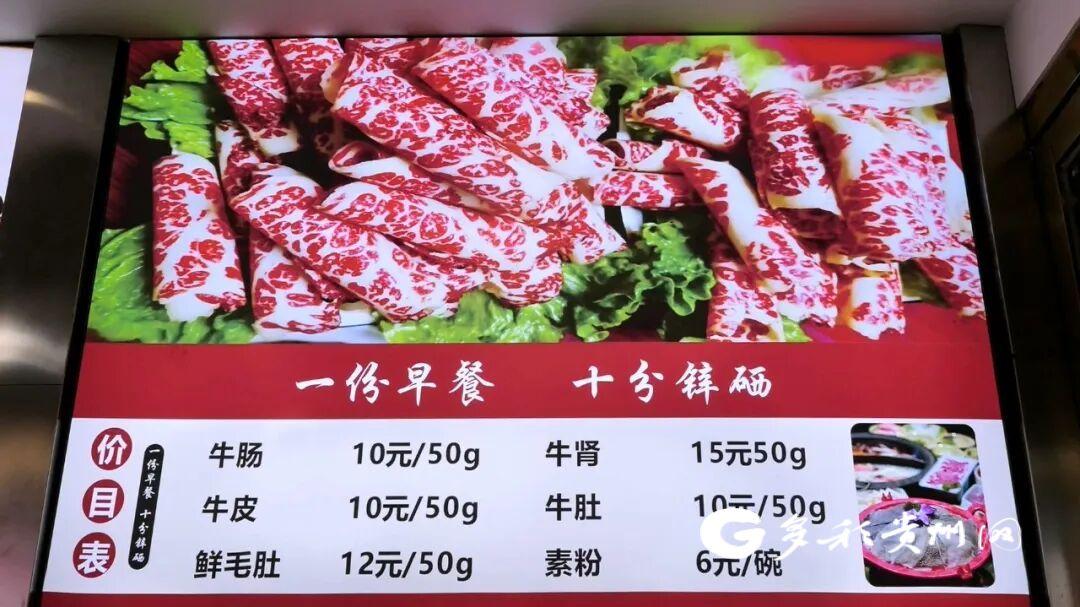多彩贵州网讯 近日,笔者在遵义市红花岗区锌硒牛坊餐饮店看到,“一份早餐、十分锌硒”的标语格外醒目。该店以凤冈县优质山地雪花牛肉为主打,推出早、中餐一体化系列菜品,以其独特口感与丰富营养,深受消费者喜爱。
